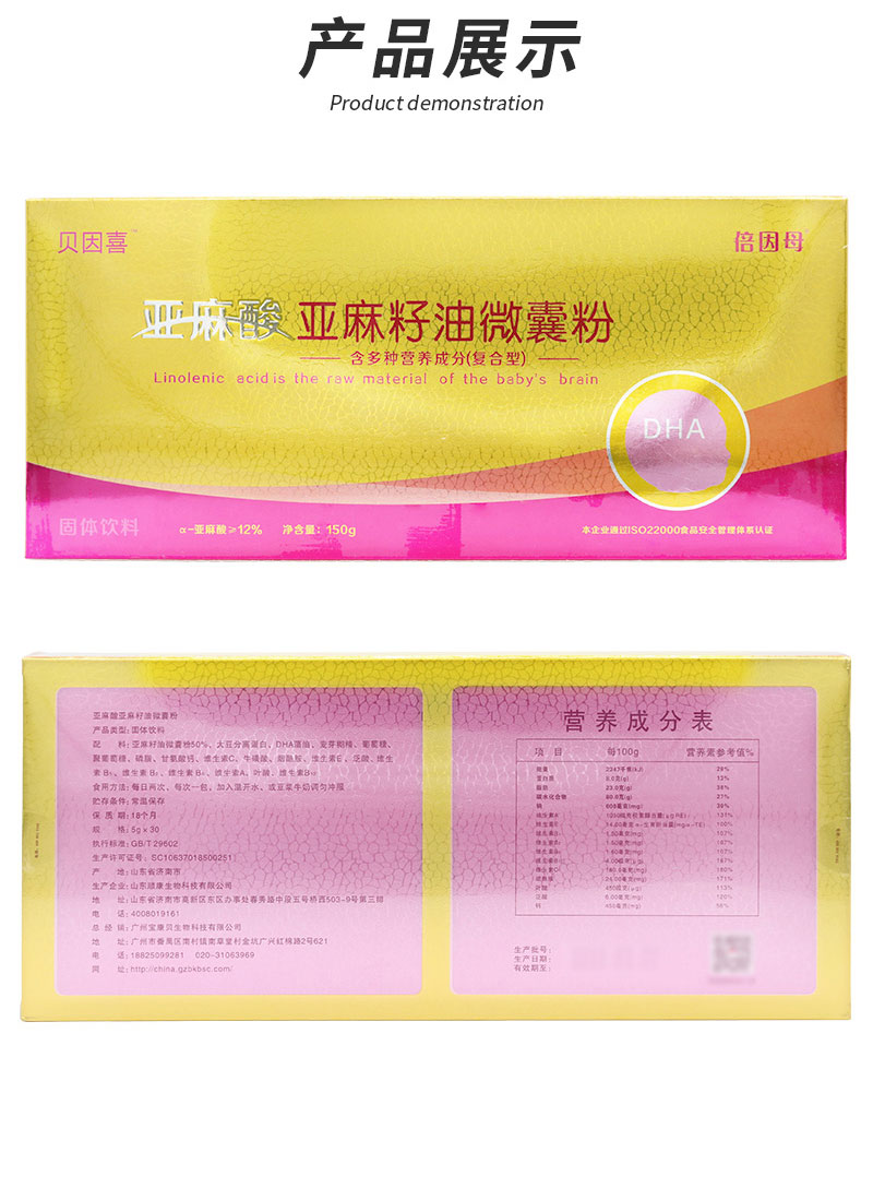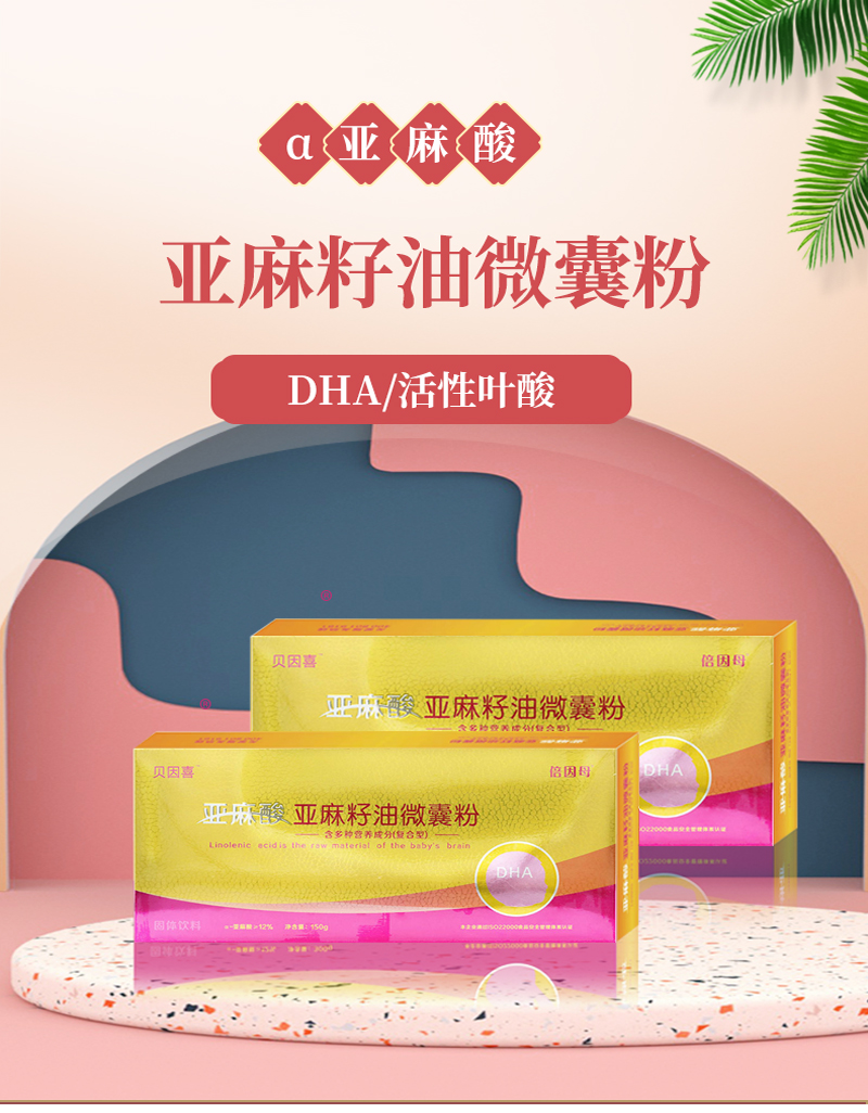 含亚麻籽油微囊粉50%,大豆分离蛋白,DHA藻油,叶酸,维生素C,维生素E,维生素A,维生素B族,泛酸,牛磺酸,烟酰胺,磷脂,,甘氨酸钙,聚葡萄糖,葡萄糖,麦芽糊精等多种成分